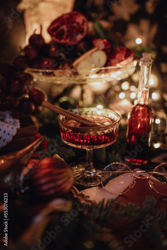 © Barbara, Fototapeta premium Christmas dark academia vintage harry potter table for two with fir, candles, mulled wine, red decorations, old books, glasses, gingerbread and chess