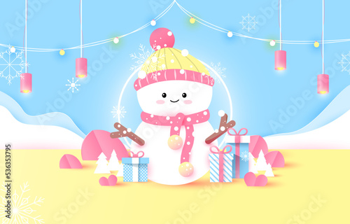 © Nattapol, Fototapeta premium christmas day. light bulb, snowflakes, snow, snowman, party.