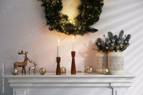Fototapeta premium Christmas decor and burning candles on fireplace near white wall indoors