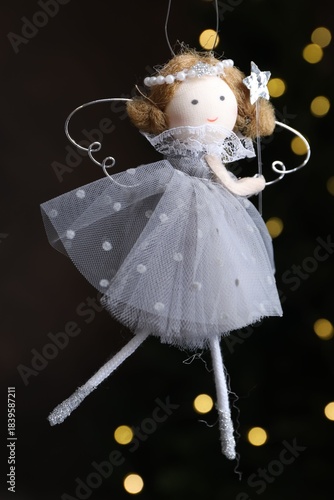© New Africa, Naklejka premium Christmas decor. Fairy doll hanging on black background with blurred lights, closeup