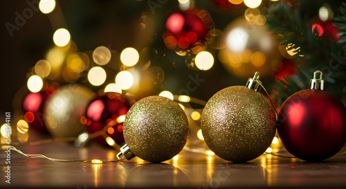 © Rifki Fachrudin, Fototapeta premium Christmas decor featuring gold red ornaments bokeh lights a dark surface