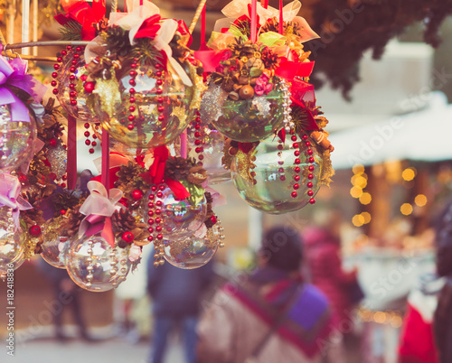© lorenza62, Naklejka premium Christmas decoration against lights blurred background. Focus on decoradet Christmas balls