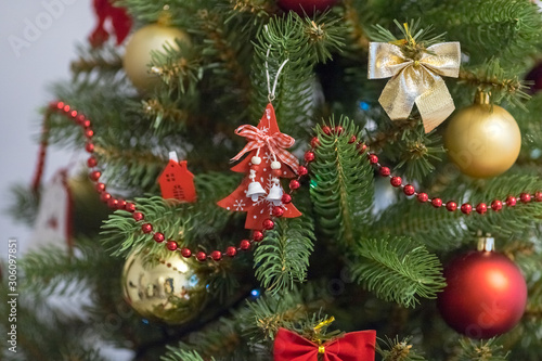 Fototapeta premium Christmas decoration and celebration. Christmas tree. Xmas red and gold balls. New Year preparations. New Year concept. Christmas tree toys.
