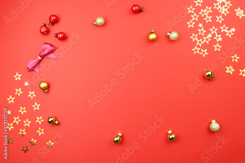 Fototapeta premium christmas decoration on red background with golden confetti stars, balls, berries. Concept holiday atmosphere, new year, celebration, greeting card. Flatlay, top view, frame, copyspace