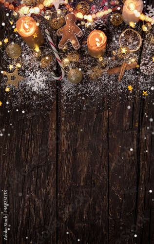 Naklejka premium Christmas decoration on wooden background, lots of copy space for product or text.