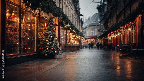 © Pakhnyushchyy, Fototapeta premium Christmas decoration tree in the shop. Winter street market in Europe.