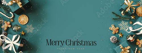 © hd3dsh, Naklejka premium Christmas decoration with Christmas presents on green background with copy space and text. Christmas banner design. 3D Rendering, 3D Illustration