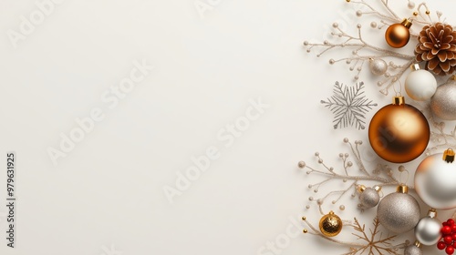 © Ckip, Fototapeta premium Christmas decoration with golden and silver baubles, pinecones, and glitter branches on a light background. Flat lay composition with copy space.