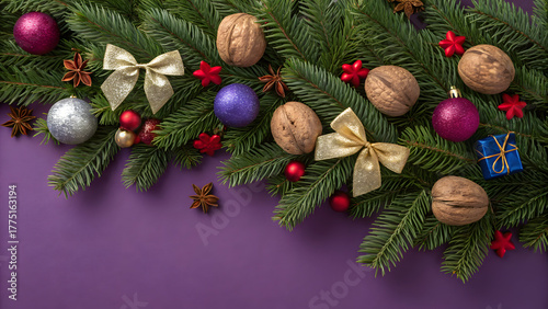 Fototapeta premium Christmas decoration with lights on purpe background