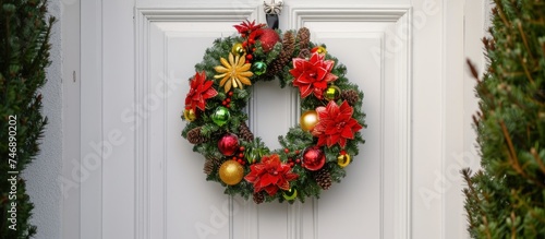 © Gethuk_Studio, Naklejka premium Christmas decoration wreath hanging on door