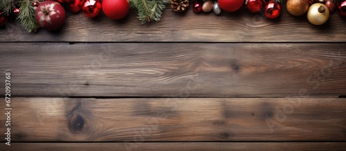 Naklejka premium Christmas decorations are displayed on a wooden table with hands resting upon it