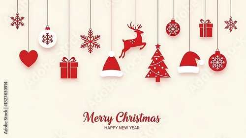 Fototapeta premium Christmas decorations hanging from strings with festive ornaments, gifts, and holiday symbols on white background