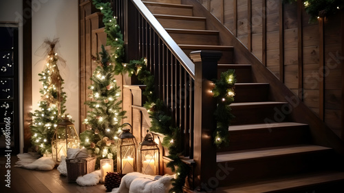 Obraz premium Christmas Decorations in the House with Wooden Stairs, Christmas Atmosphere, High-Quality 4K