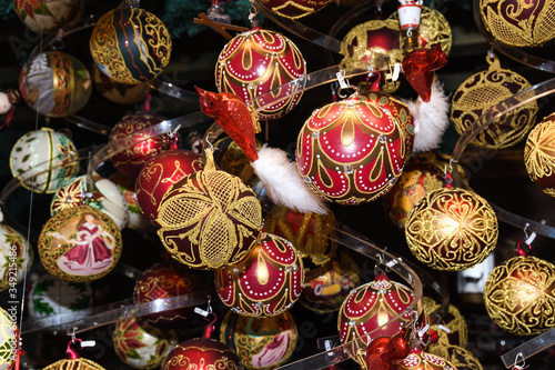 © Alexe, Fototapeta premium Christmas decorations on the market in Vienna.Golden balls, bulbs, bubbles,decorations and ornaments