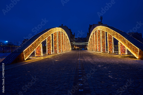 © GKor, Fototapeta premium Christmas decorations on the steel structure of the bridge at night