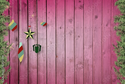 © vectorfusionart, Obraz premium Christmas decorations over wooden planks