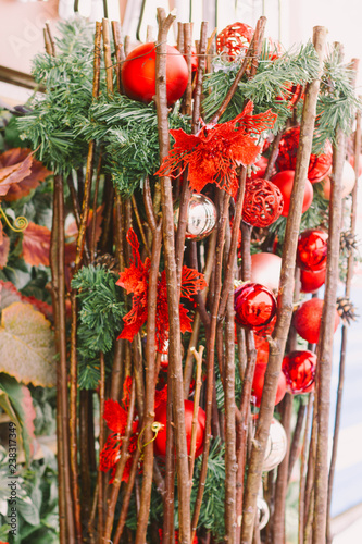 © dvulikaia, Fototapeta premium christmas decorations with glass balls and twigs