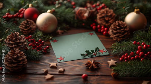 Fototapeta premium Christmas decorations with pine cones and ornaments on table
