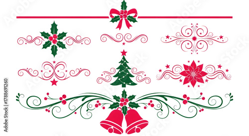 Obraz premium Christmas decorative elements with holly, poinsettia, bells, and swirls in red and green