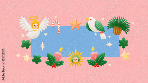 Naklejka premium Christmas decorative frame (wallpaper, poster, banner) with angel, candy cane, star, bird, plant, candle, holly & sun accent. Festive holiday design in soft pastel style.