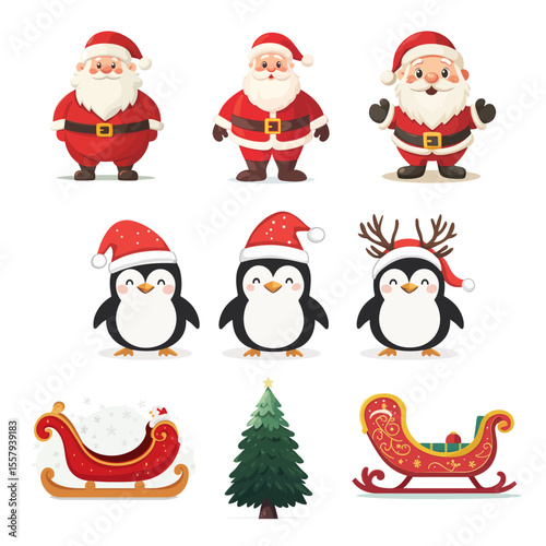 © Olha, Fototapeta premium Christmas design elements santa, gift, tree, penguins, snow, sled. Vector illustration of set of isolated on plain background new year elements.