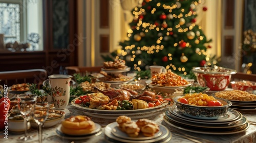 Naklejka premium Christmas Dinner table full of dishes with food and snacks, New Year's decor with a Christmas tree on the background.