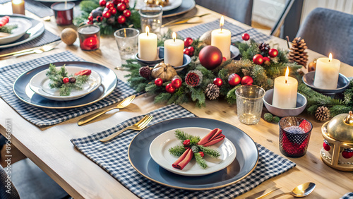 Naklejka premium Christmas dinner table with festive decorations and candles