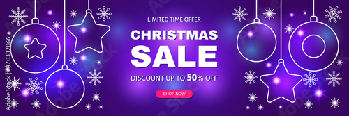 © webdesign, Obraz premium Christmas discount sale banner. Flat design of Christmas balls and snowflakes. Abstract background with glow and geometric shapes. Final sale up to 50% off. Special offer. Template vector illustration