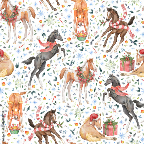 Naklejka premium Christmas equestrian seamless pattern with cute foals and holiday...