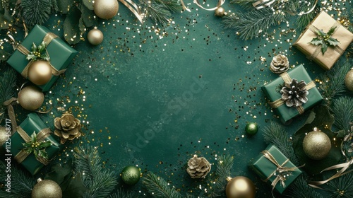 Fototapeta premium Christmas Eve concept with a vertical top-down shot of gift boxes, ribbons, gold and green baubles, confetti, and pine branches on a green backdrop