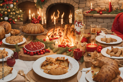 Fototapeta premium Christmas Feast Extravaganza, Lavish Dinner Setting, Twinkling Fairy Lights, Seasonal Indulgence