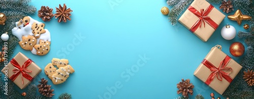 Fototapeta premium Christmas Festival Minimalistic Design with Gift Boxes Ornaments and Cookies on Bright Cyan Background