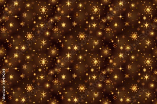 Fototapeta premium Christmas festive seamless pattern with snowflakes and sparkles. Gold shining dark background for textile, holiday wrapping paper, scrapbooking, web and print