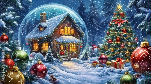 Fototapeta premium Christmas festive snow globe with house and fir tree. Happy New Year and...