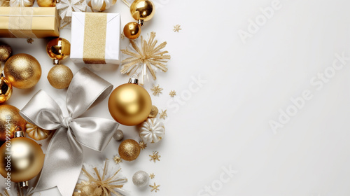 Fototapeta premium Christmas Flat Lay Background.Beautiful christmas golden shiny decorations on a white background.New Year composition.Holiday card.Top view, copy space, Created using generative AI tools.