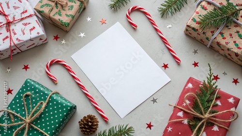 © RisanRisan, Obraz premium Christmas flat lay ornaments pine cones gift boxes neutral background copy space
