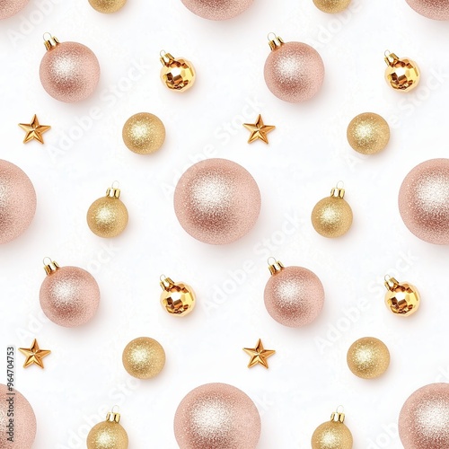 © Sunny_nsk, Fototapeta premium Christmas flat lay pink and golden glittery ornaments seamless texture, endless repeatable rapport element.