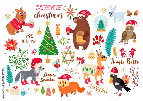 Naklejka premium Christmas forest animals set in cartoon style with calligraphy and other elements. Vector illustration. New Year decoration elements collection isolated on white background. Winter holidays