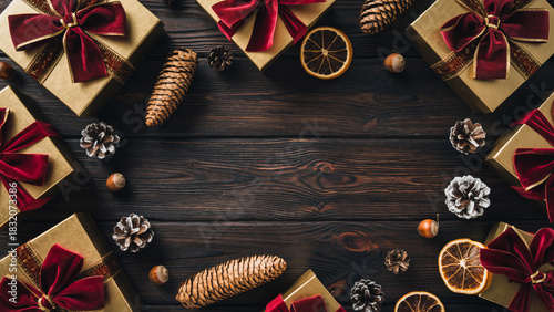 © Designbrisa, Fototapeta premium Christmas Frame with Gold Gifts Red Ribbons and Pine Cones on Dark Wooden Background.