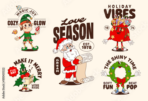 © Buch&Bee, Naklejka premium Christmas funny groovy characters retro stickers and t shirt prints. Vector cute vintage Santa Claus, festive elf, gift bag, wreath and holly cartoon personages with holiday quotes and Xmas greetings
