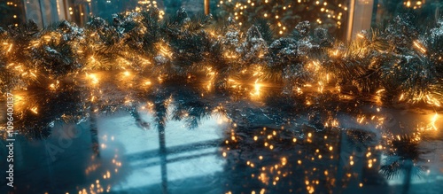 Naklejka premium Christmas garland illuminated with warm lights reflecting on a glossy glass...