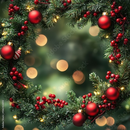 Fototapeta premium Christmas garland with red and gold baubles, berries, and pinecones on a...