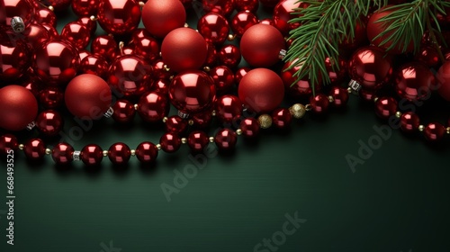 Fototapeta premium Christmas Garland with Red Balls and Fir Branches on Vibrant Green...