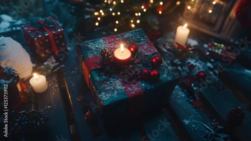 Obraz premium Christmas Gift Box with Candlelight and Snow Festive Winter Scene