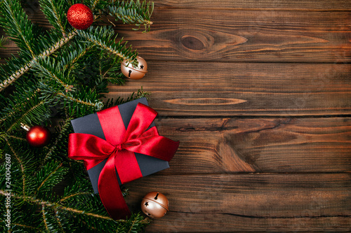 Fototapeta premium Christmas gift box wrapped in kraft black paper with red ribbon decoration on rustic brown wooden background with fir tree, tree decoration and gold bells. Flatlay style.