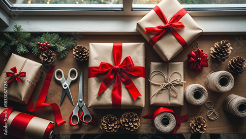 © Designbrisa, Obraz premium Christmas Gift Wrapping Flatlay with Presents, Pinecones and Holiday Decorations
