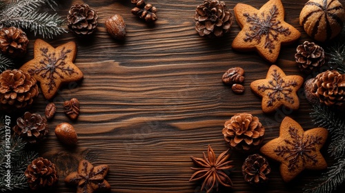 © NhV, Fototapeta premium christmas gingerbread cookies on wooden table top view with copy space