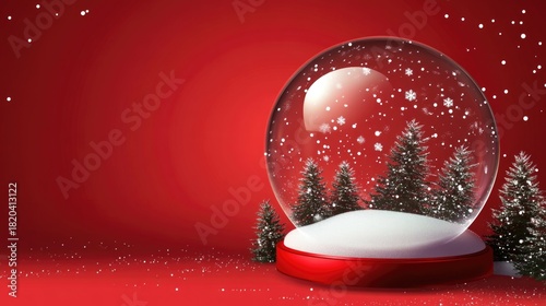 © Hope, Fototapeta premium Christmas glass snow globe empty stands on the snow with fir trees. Red background with realistic 3d transparent snow ball. Xmas platform podium. Holiday banner and poster