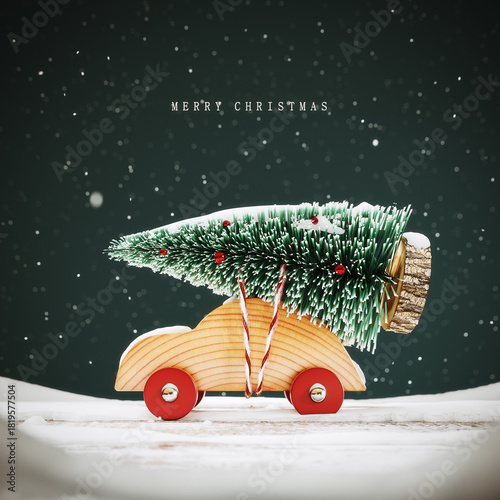 © hd3dsh, Naklejka premium Christmas greeting card design with text. Cute wooden toy car carrying fir tree on the roof. 3D Rendering, 3D Illustration