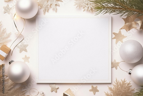 © Synthetica, Obraz premium Christmas greeting card mockup with white christmas decorations on white background. Flat lay, top view, copy space.